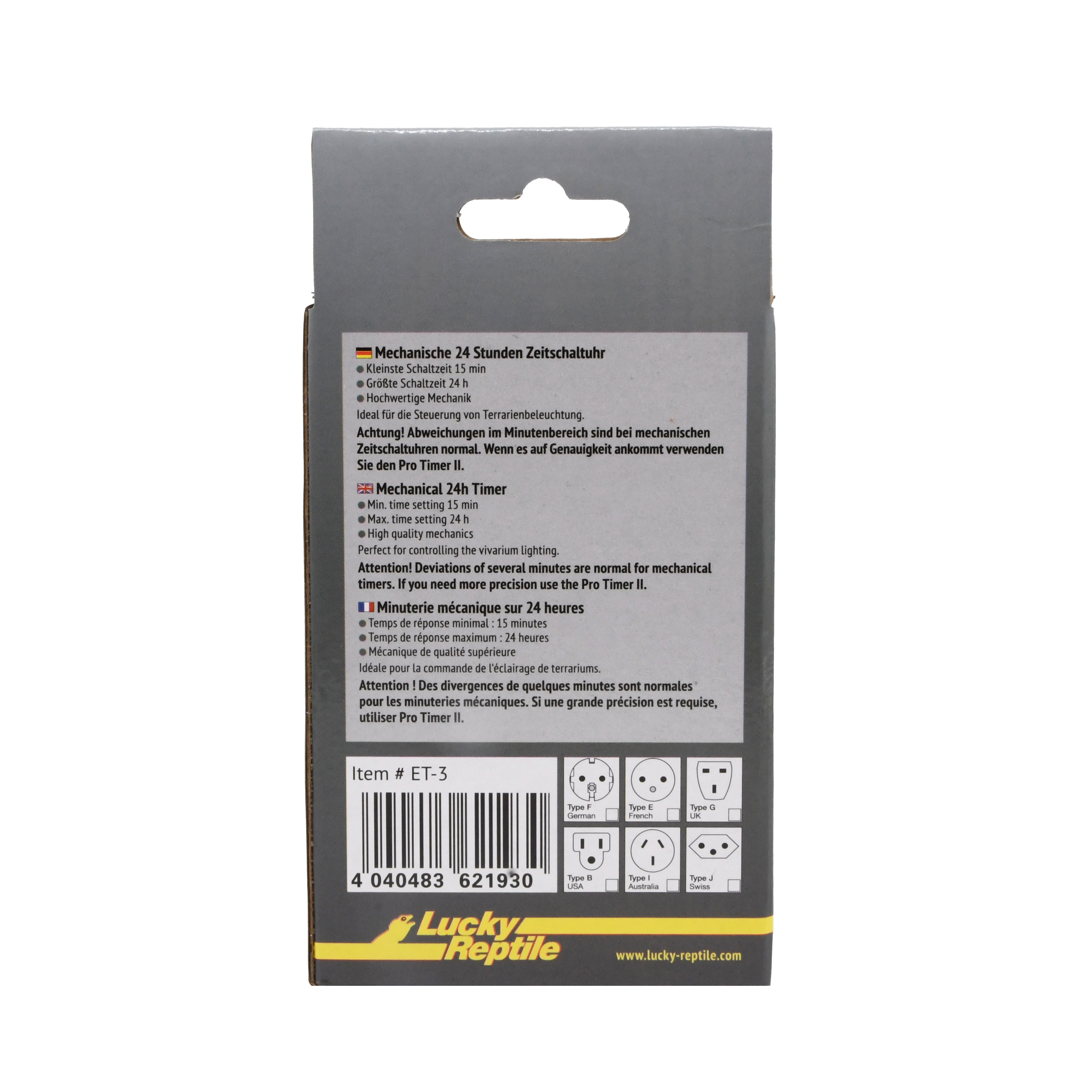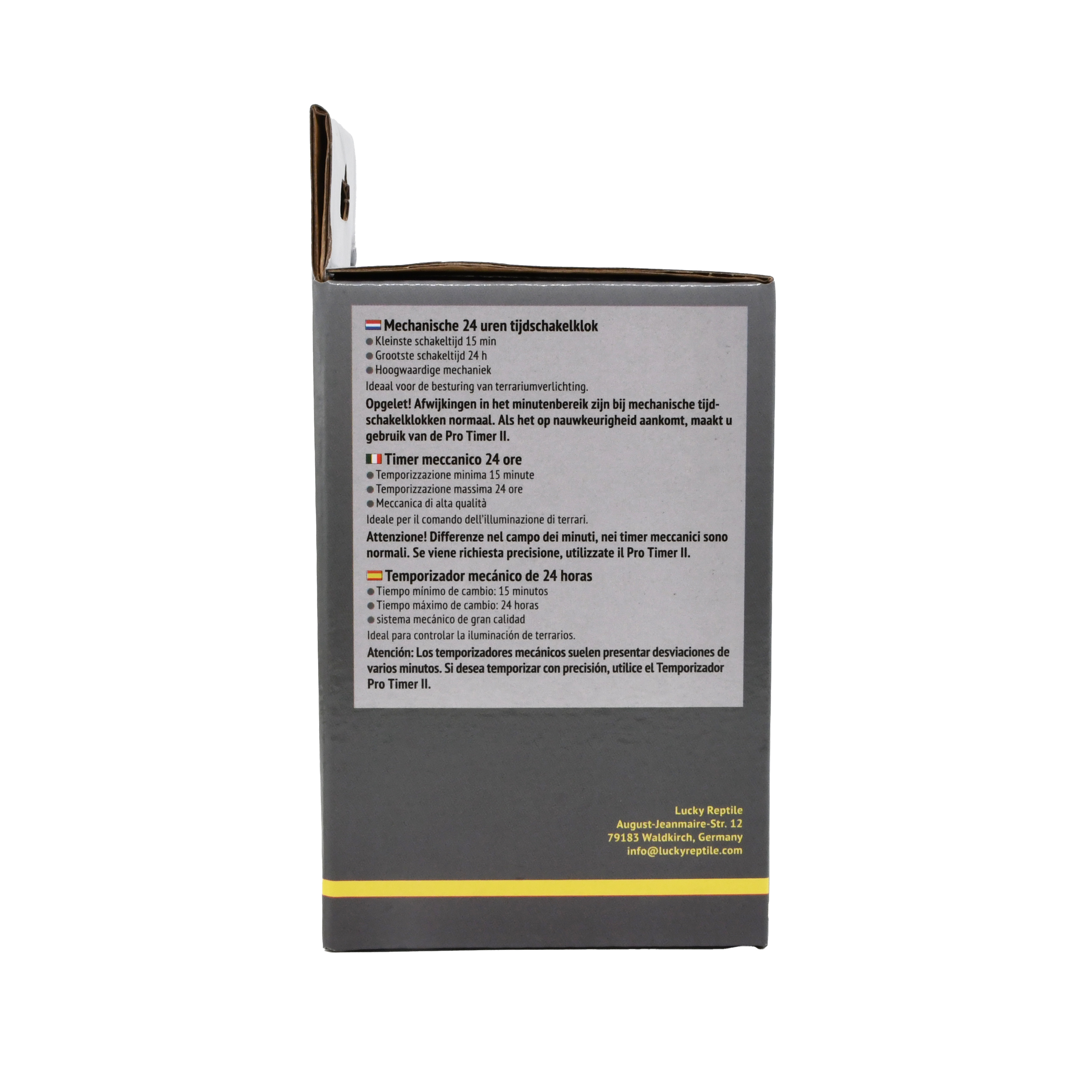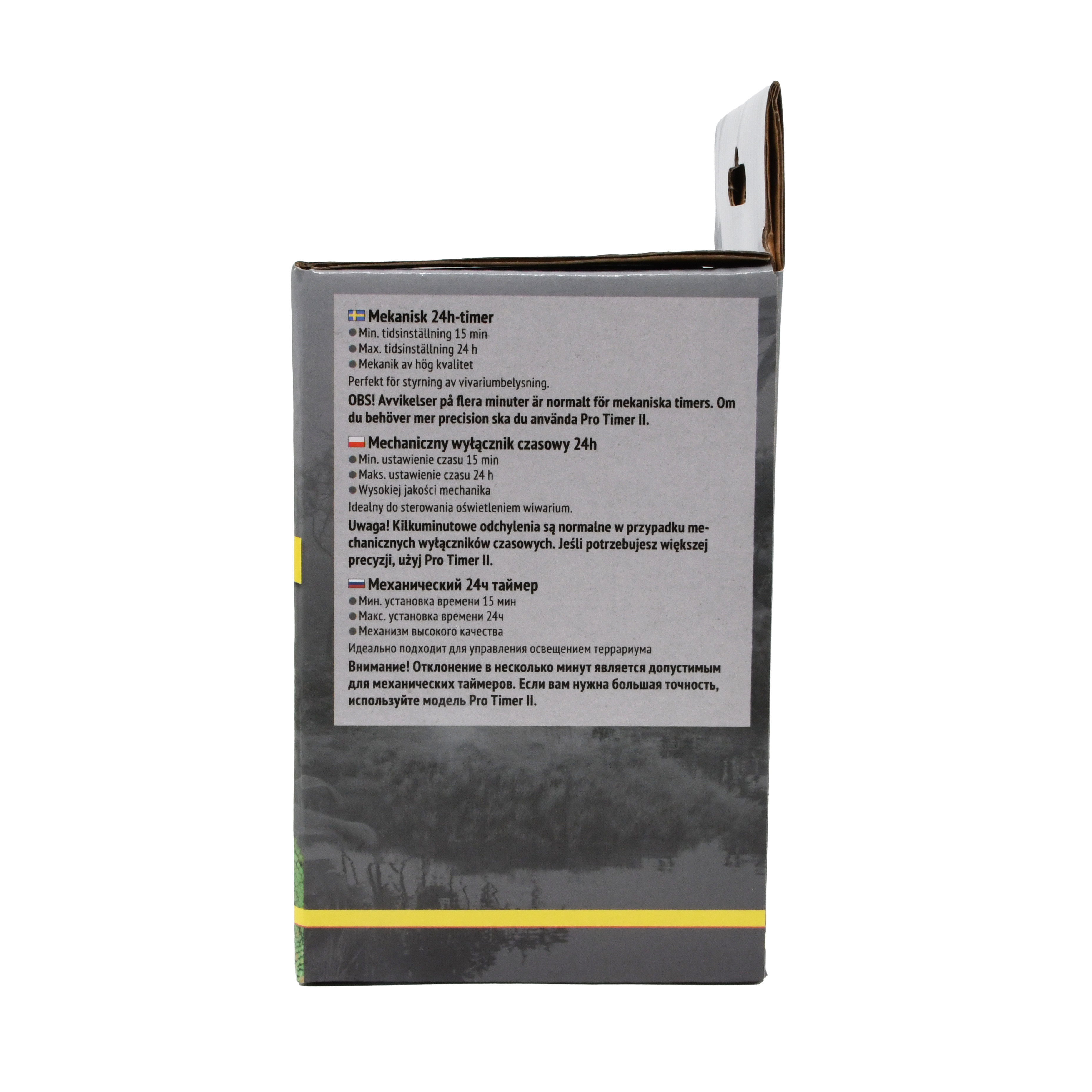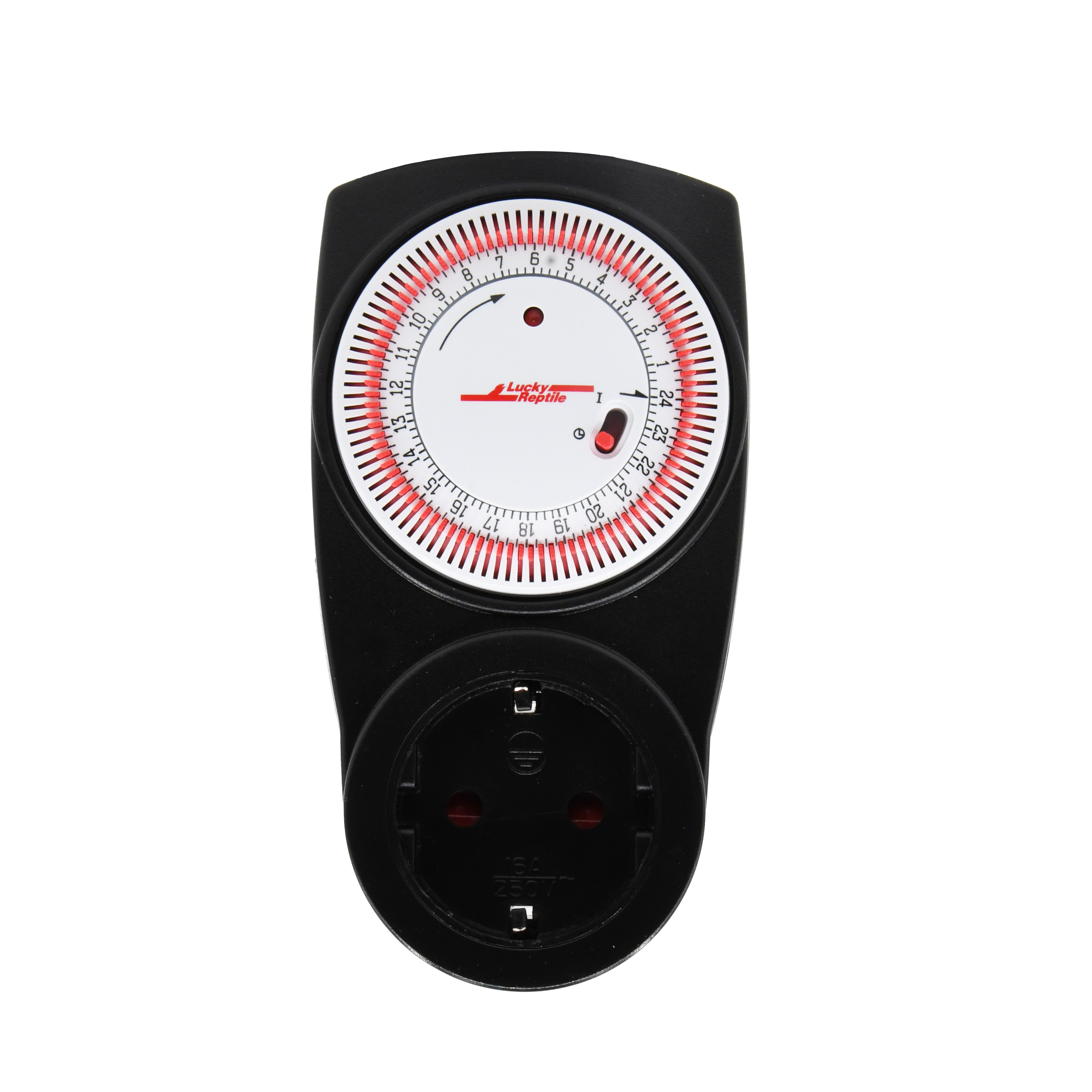 The ECO Timer is a mechanical timer for wattages up to 3500W. The special construction of the dial prevents the accidental change of settings, which is a common problem with other timers. The smallest period is 15 minutes. The timer is perfect for controlling the vivarium lighting. Note that for this type of timer deviations of a few minutes are normal. For applications demanding high precision we recommend the use of the PRO Timer.